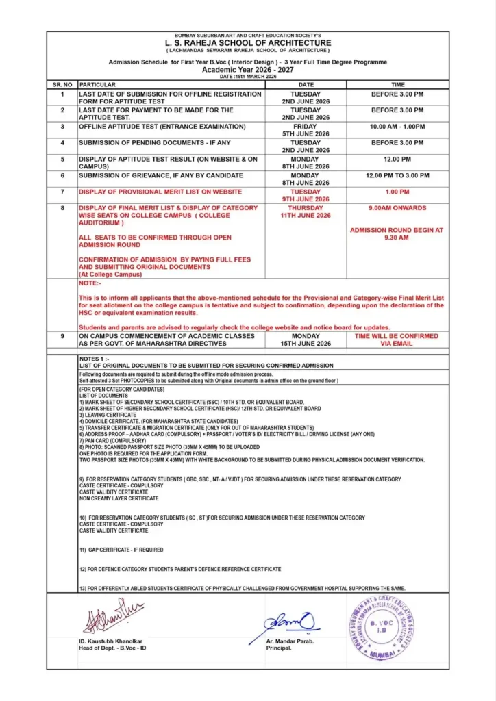 The Candidates aspiring to take admission to B.Voc (ID) programme shall fill the form in the institutes admin office on the ground floor, at Bombay Suburban Art and Craft Education Society, L.S. Raheja School of Architecture for the academic year 2026 – 2027.